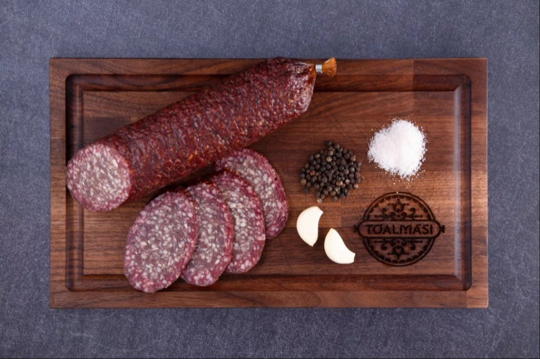 Tóalmåsi GRISFRI Paprikafri Nötköttssalami Àr en halvtorr, traditionellt lagrad, stenrökt salami utan paprika, gjord enligt ett traditionellt familjerecept, som innehÄller grÄtt nötkött, talg, malen vitlök, bordssalt, kumminfrön och malen svartpeppar. Den Àr konserverad med naturlig boktrÀrök genom kallrökning.
